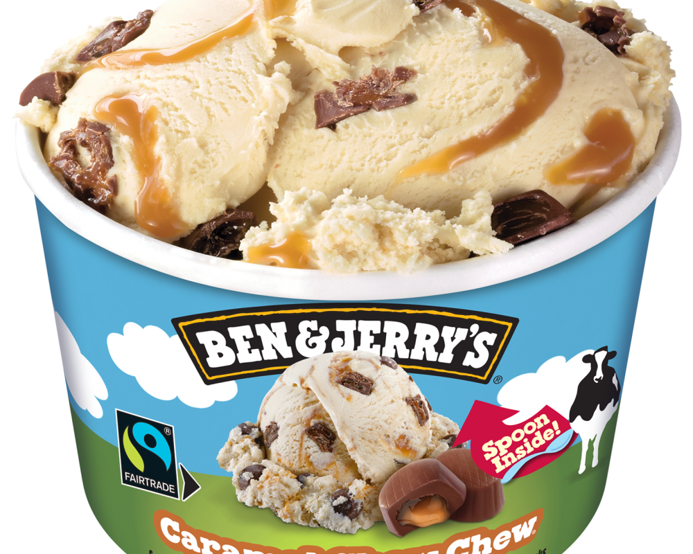 Ben and Jerry’s Mini Caramel Chew Chew, Caramel ice cream frozen dessert with a caramel swirl and chocolatey covered caramel chunks.