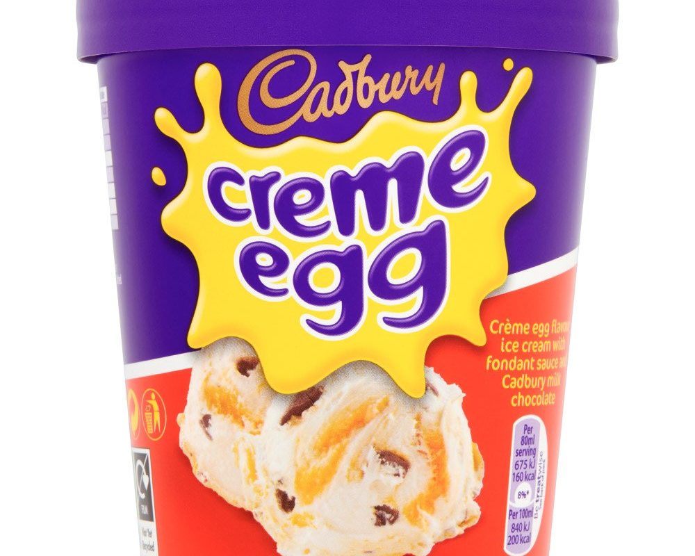 Cadbury’s Creme Egg Ice Cream Tub, Crème egg flavour ice cream with fondant sauce and Cadbury milk chocolate.