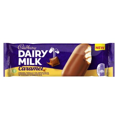 Cadbury’s Dairy Milk Caramel Ice Cream Stick, Vanilla Ice Cream with Caramel Flavoured Sauce, Dipped in a Caramel Flavoured Coating and Milk Chocolate.