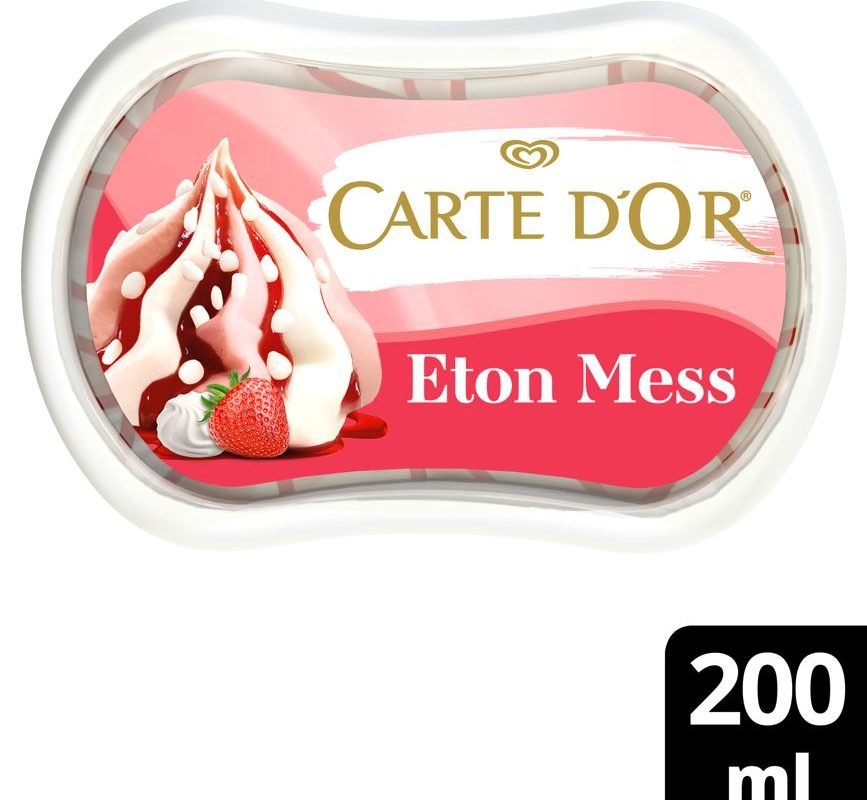 Carte D'or Mini Indulgence Eton Mess, Marrying smooth Carte D'Or strawberry and vanilla flavour ice cream, crunchy meringue pieces and lavish swirls of strawberry sauce.