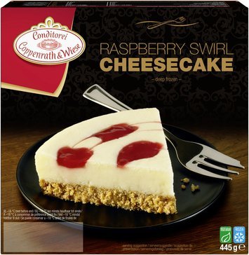 Coppenrath and Wiese Raspberry Swirl Cheesecake, Tangy raspberry sauce swirled into a deep layer of cheesecake on a crunchy biscuit base.