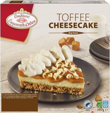 Coppenrath and Wiese Toffee Cheesecake, Smooth Cheesecake on a crispy biscuit base, topped with rich toffee sauce and delicious cream.