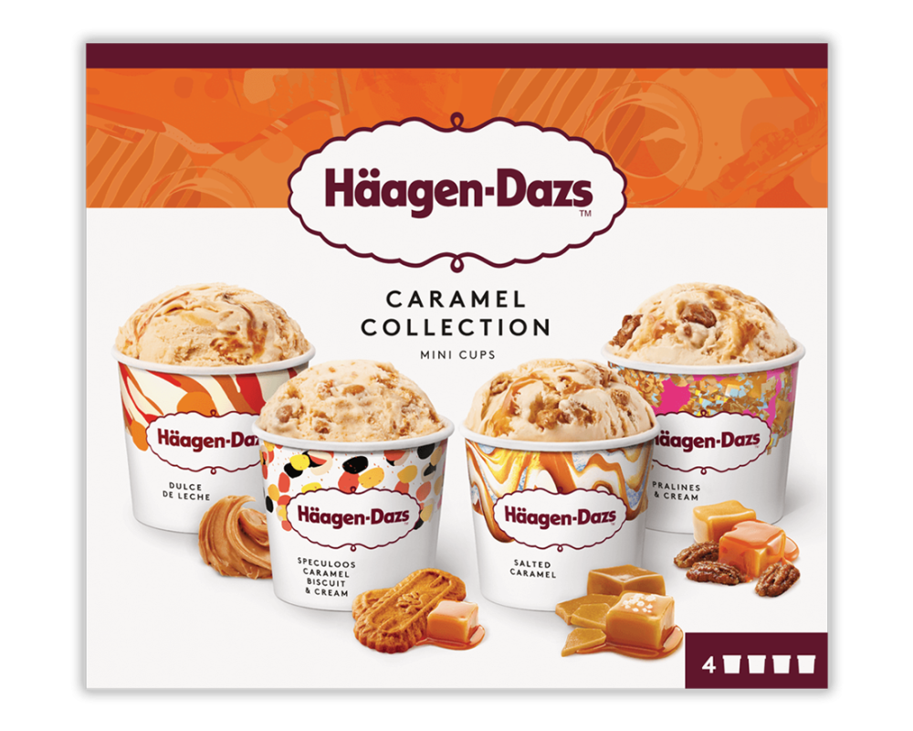 Haagen-Dazs Mini Caramel Collection, Four mini cups of joy await any caramel lover in this collection: Speculoos Caramel Biscuit and Cream, Salted Caramel, Dulce De Leche and Pralines and Cream.
