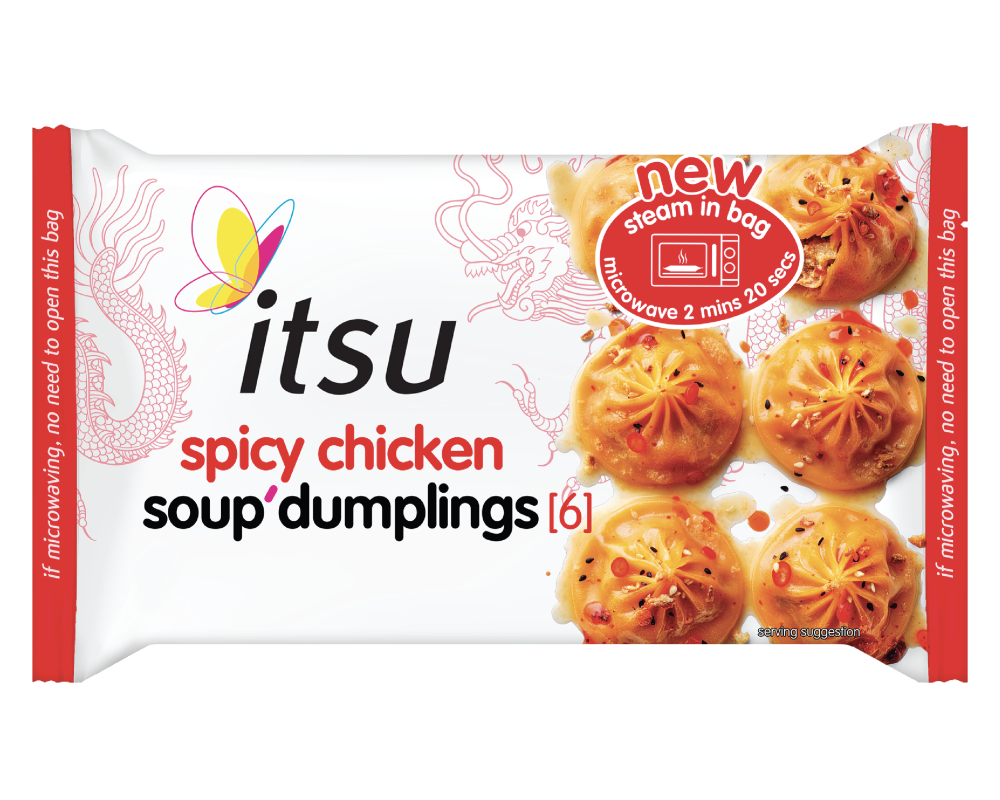 Itsu Spicy Chicken Soup Dumplings, Eat beautiful, Chicken & kimchi with a mildly spicy soupy centre, Steam in bag microwave 2 mins 20 secs, Source of protein, If microwaving, no need to open this bag