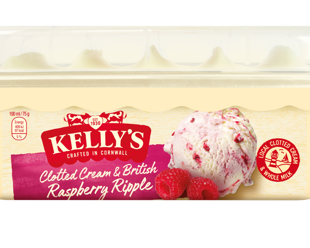 Kelly's Clotted Cream and Raspberry Tub 950ml, Our luscious, creamy and fruity Clotted Cream & British Raspberry Ripple is made with Cornish whole milk & you guessed it; clotted cream from the West Country's local dairy herds.