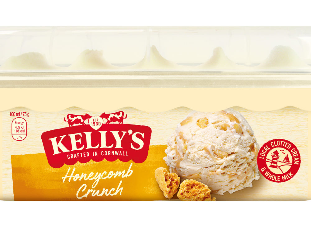 Kelly’s Honeycomb Crunch Tub 950ml, We make our indulgent Honeycomb Crunch with Cornish whole milk & clothed cream from the West country’s finest dairy herds.