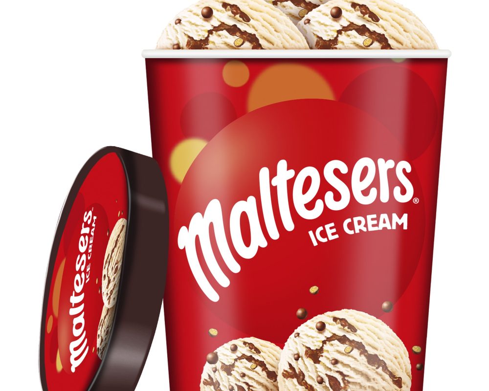 Maltesers Ice Cream Tub, Malt flavoured ice cream with milk chocolate sauce and crispy cocoa coated malt pieces.