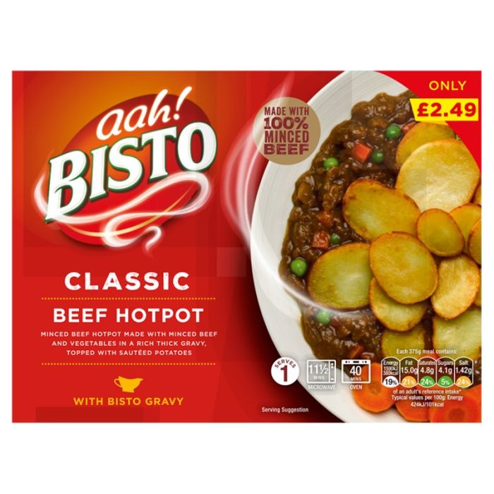 Bisto Classic Beef Hotpot made with minced beef and vegetables in a rich thick gravy, topped with sautéed potatoes. 11 1/2 Mins Microwave. 40 Mins Oven. Made with 100% Minced Beef.