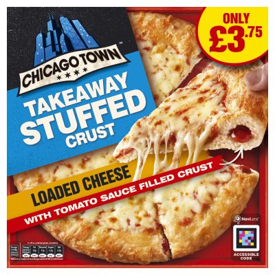 Chicago Town Takeaway Cheese Pizza, Tomato sauce stuffed crust pizza base topped with tomato sauce, mozzarella, mature Cheddar, Monterey Jack and Emmental.