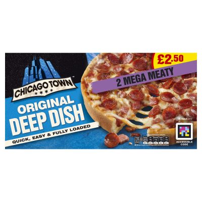 Chicago Town Twin Deep Dish Mega Meaty Pizza, topped with tomato sauce, mozzarella cheese, a blend of pepperoni and reformed smoke flavoured ham and fennel sausage.