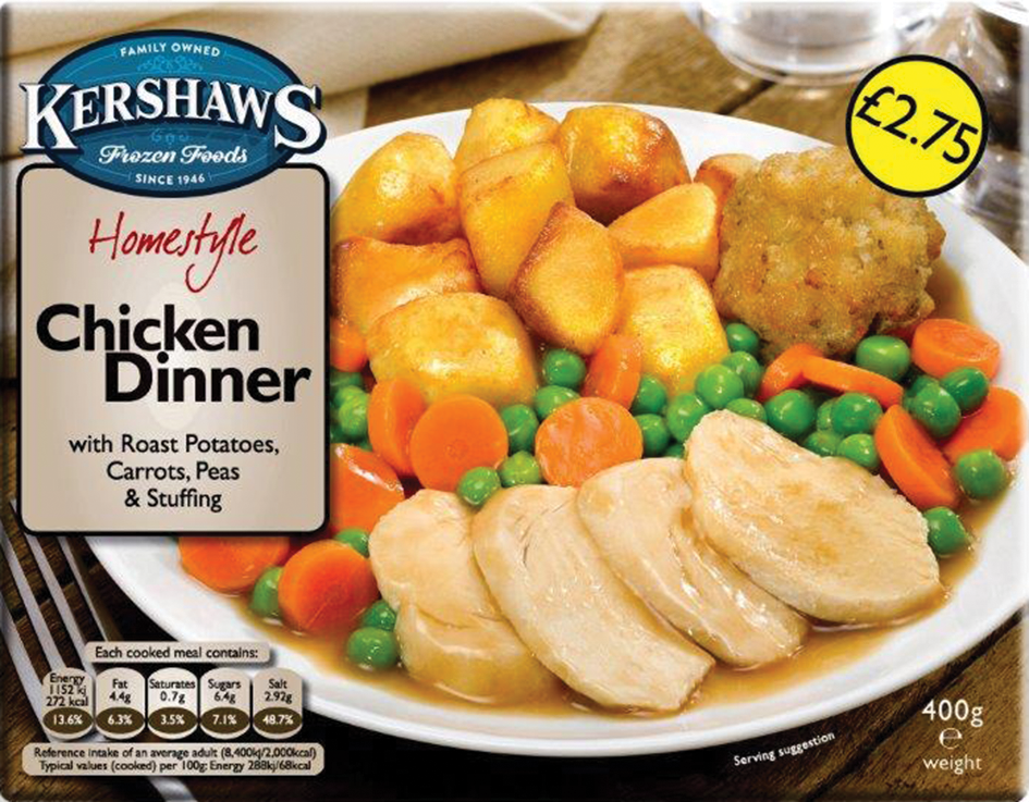 Kershaws Homestyle Chicken Dinner with Roast Potatoes, Carrots, Peas & Stuffing